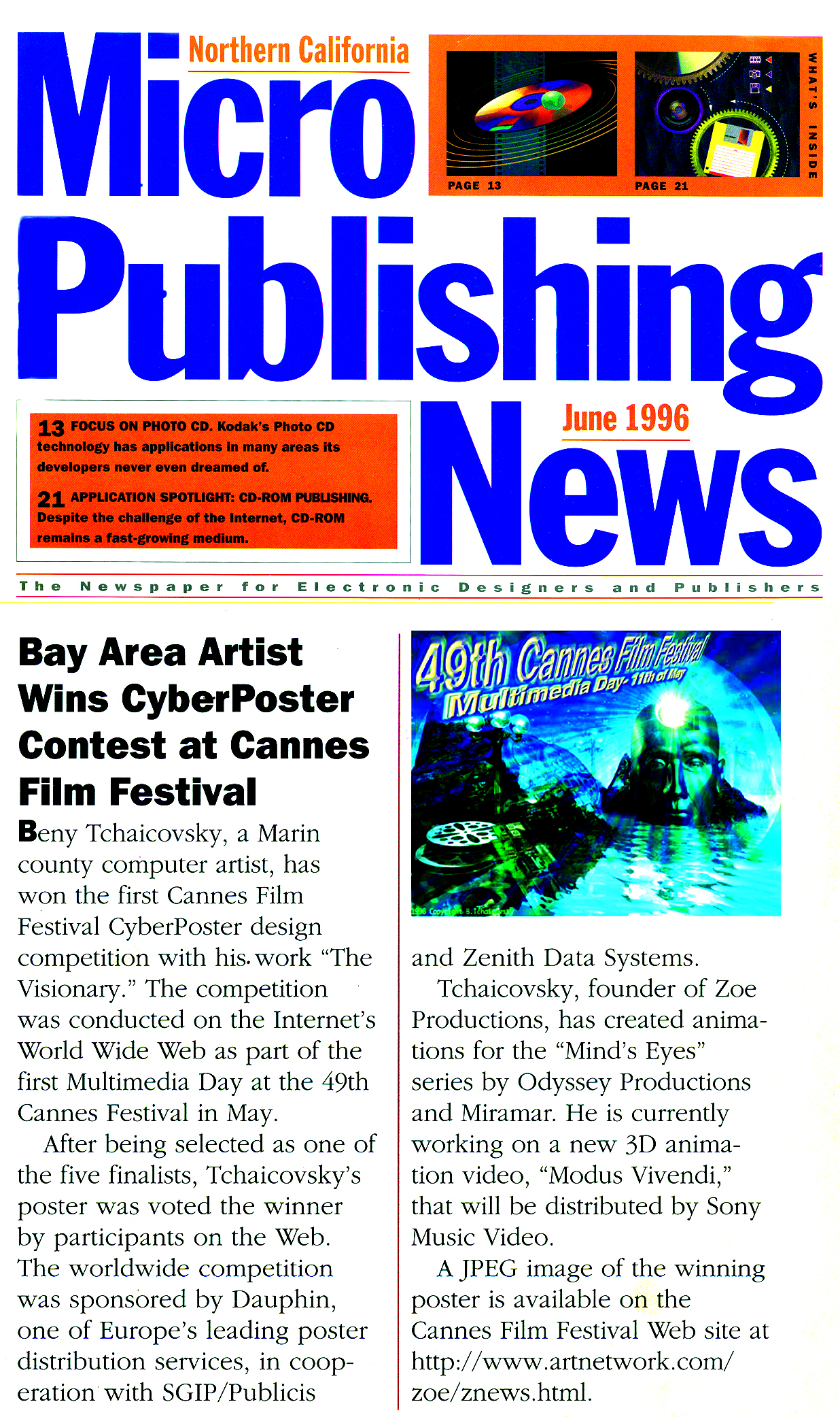 His work, “The Visionary” was awarded 1st place in the International contest for the best cyber-poster in the first “Multimedia Day of the 49th Cannes Film Festival.” He was invited to France to receive his award. The winning image was shown in billboards in Paris and seen by millions of people.
